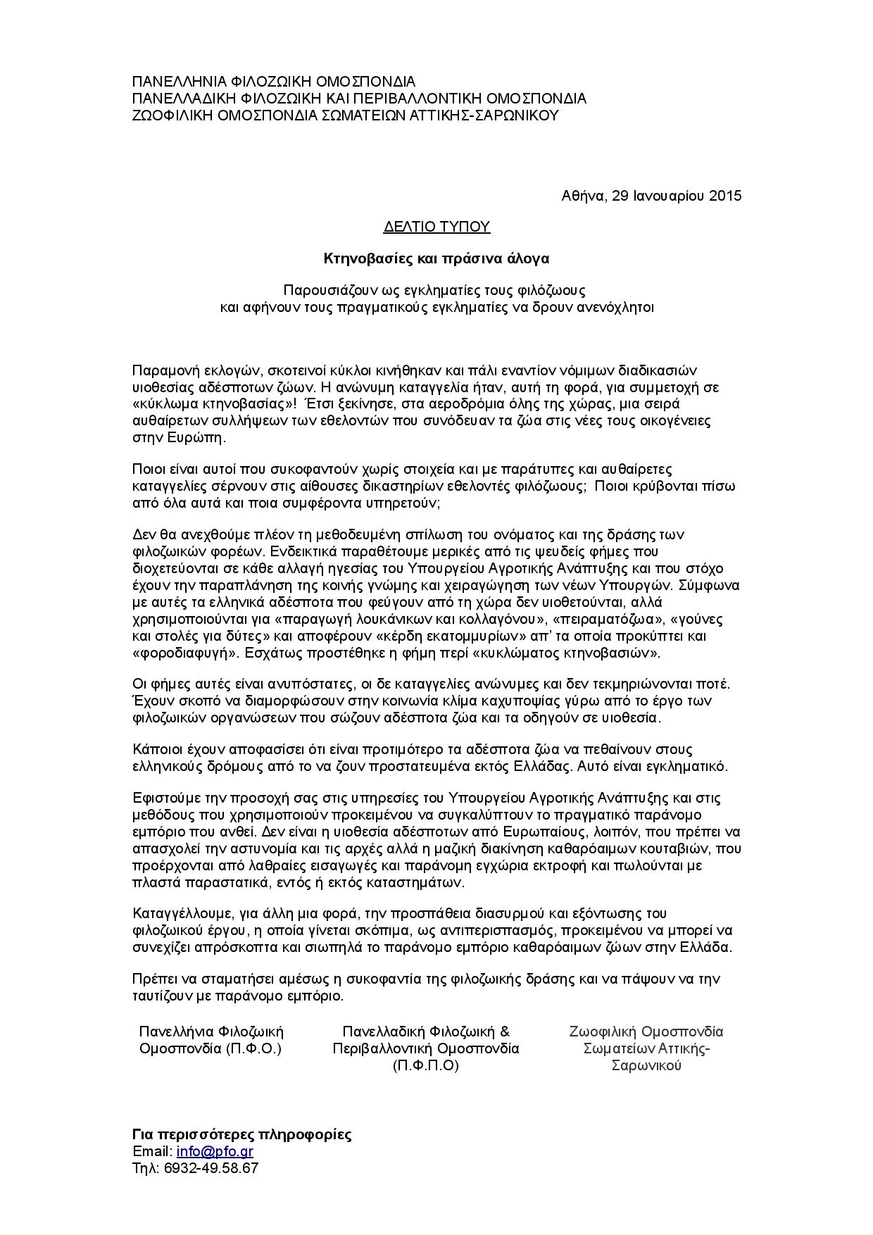 Δεν θα ανεχθούμε πλέον τη μεθοδευμένη σπίλωση του ονόματος και της δράσης των φιλοζωικών φορέων. Ενδεικτικά παραθέτουμε μερικές από τις ψευδείς φήμες που διοχετεύονται σε κάθε αλλαγή ηγεσίας του Υπουργείου Αγροτικής Ανάπτυξης και που στόχο έχουν την παραπλάνηση της κοινής γνώμης και χειραγώγηση των νέων Υπουργών. Σύμφωνα με αυτές τα ελληνικά αδέσποτα που φεύγουν από τη χώρα δεν υιοθετούνται, αλλά χρησιμοποιούνται για «παραγωγή λουκάνικων και κολλαγόνου», «πειραματόζωα», «γούνες και στολές για δύτες» και αποφέρουν «κέρδη εκατομμυρίων» απ’ τα οποία προκύπτει και «φοροδιαφυγή». Εσχάτως προστέθηκε η φήμη περί «κυκλώματος κτηνοβασιών».