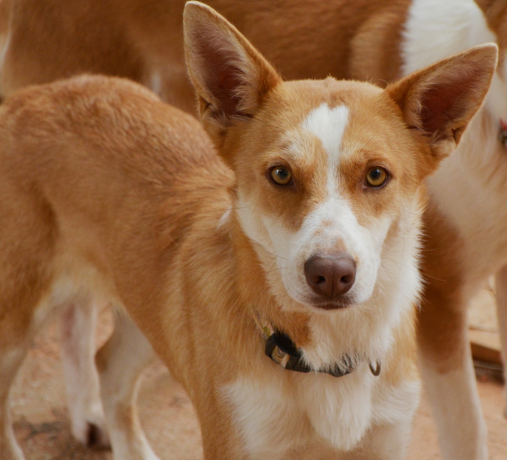 Thin. blond with golden eyes, this is our Gertrude. Approx one and a half years old. When we found her she was scared but now she is learning to trust people around her and is doing good!