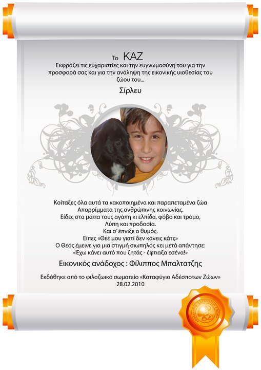 Όταν πάρετε την απόφασή σας, μας στέλνετε ένα mail στο kazshelter@gmail.com, αναφέροντας τα στοιχεία σας : όνομα, επίθετο, διεύθυνση και ΤΚ, τηλέφωνο επικοινωνίας, καθώς και το σκυλάκι που θέλετε να υιοθετήσετε και το ποσό που θα διαθέτετε κάθε μήνα.