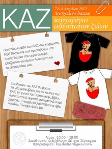 Aγαπημένοι φίλοι του ΚΑΖ, σας ευχόμαστε Καλό Πάσχα και σας προσκαλούμε στο πρώτο Μπαζάρ που οργανώνουμε στις 7 και 8 Απριλίου, ελπίζοντας να κάνουν Ανάσταση και τα αδεσποτάκια μας.