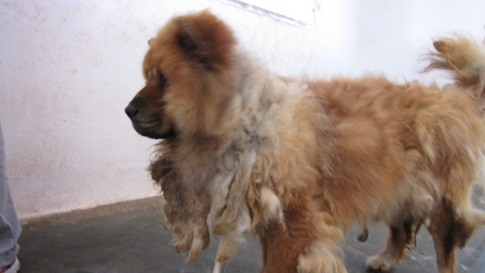 Έτσι τον παράτησαν δεμένο στο δέντρο.  Καθαρόαιμο Chow Chow με ακαταχώρητο μικροτσίπ σε κατάσταση που δεν είχαμε ξαναδεί.  Σαν να ήταν δεμένος κάπου με αλυσίδα μισού μέτρου για όλη του τη ζωή κι εκεί που καθόταν και κοιμόταν, εκεί έκανε κι όλες του τις ανάγκες. Αγωνιούσε από τον πόνο κάθε φορά που έπρεπε να κάνει ένα βήμα, αλλά η μεγάλη του αγωνία ήταν να αναπνεύσει.  Σήμερα, 1/1/13, που η ζωή ξαναβρήκε τον κανονικό της ρυθμό τον πήγαμε στον ορθοπεδικό μας να δει ένα μεγάλο εξόγκωμα που είχε στα πλευρά.  Και μόλις ξάπλωσε στο τραπέζι και τον γύρισε ο γιατρός στο πλάϊ για να του κάνει την ακτινογραφία, πέταξε η ψυχούλα του…  Έφυγε σαν πουλάκι…  Η ακτινογραφία δείχνει τον τεράστιο όγκο που κάλυπτε την καρδιά και τους πνεύμονές του αφήνοντας ελεύθερο ένα απειροελάχιστο τμήμα για να παίρνει αυτές τις αγωνιώδεις αναπνοές όσο ζούσε.