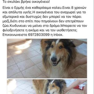 Λίγες μέρες πρίν είδαμε μια ανάρτηση αναζήτησης λύσης για το σκυλί (φυλής Κόλευ) μιας οικογένειας που αναχωρεί για το εξωτερικό. Στην ανάρτηση αναφερόταν πως το ζώο κινδύνευε να βρεθεί στον δρόμο.